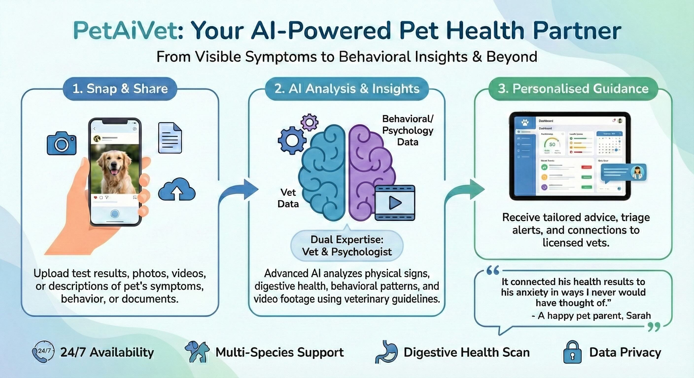 Get expert-level guidance anytime, bringing happiness and confidence to pet ownership.